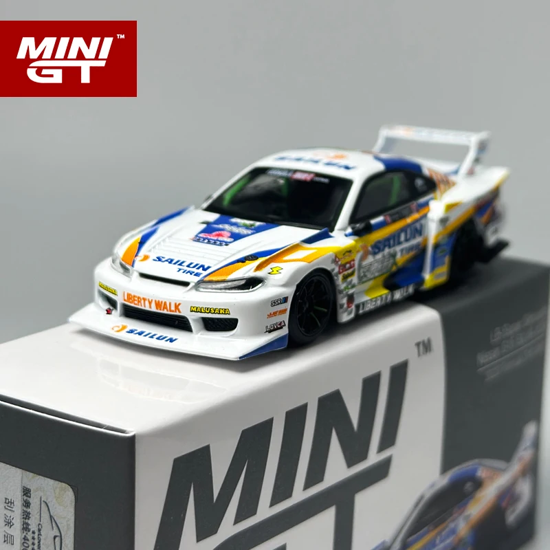 ¡La leyenda del estilo Super Silhouette vuelve a rugir en formato 1:64! Este Nissan S15 Silvia #555 de MINIGT destaca con su agresivo kit Liberty Walk, líneas afiladas y un acabado blanco impecable que refleja pura potencia japonesa. Cada detalle —alerón extremo, carrocería ancha, llantas precisas— está recreado con una fidelidad que enamora a cualquier coleccionista.